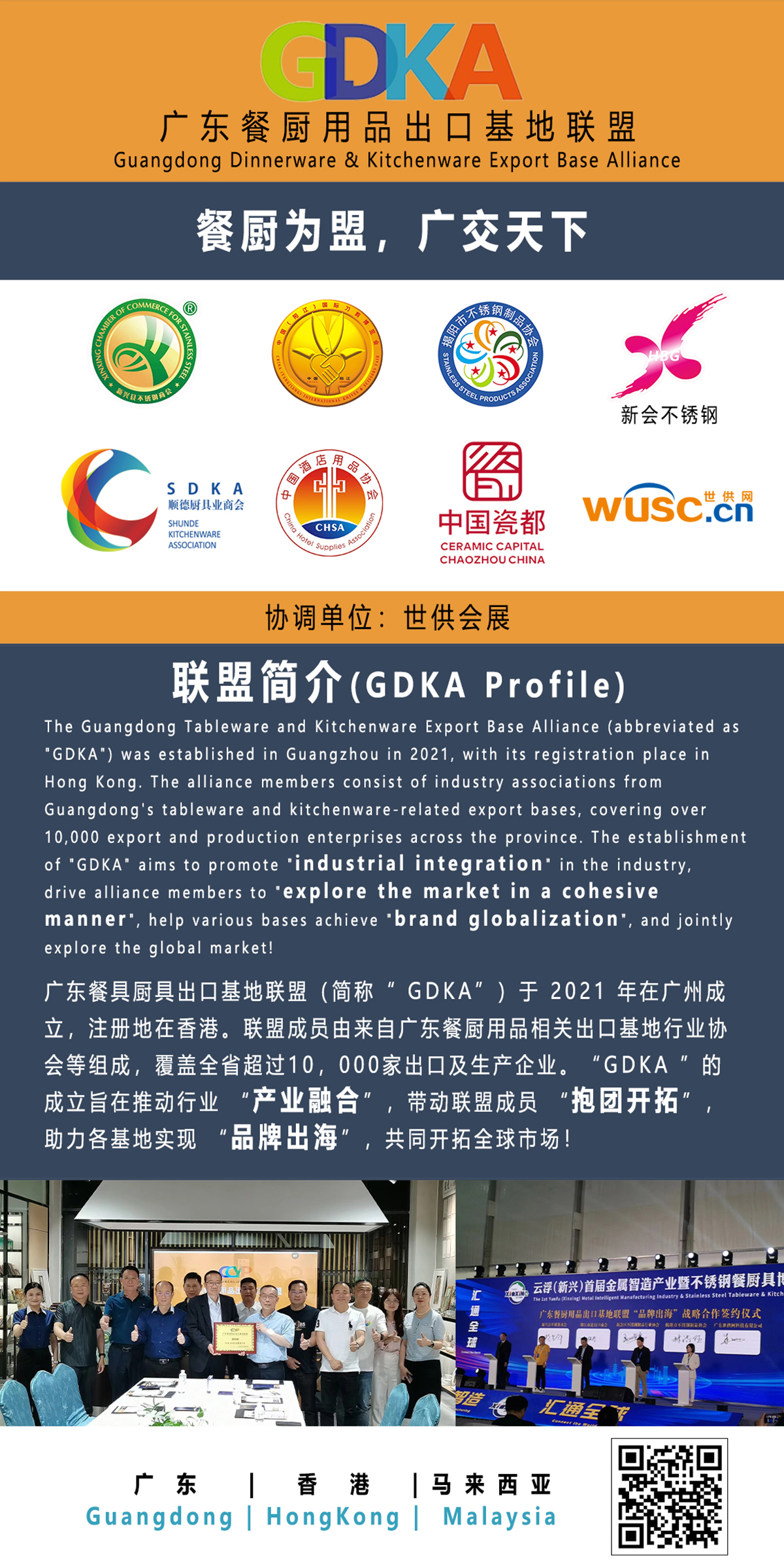 广东餐具厨具出口基地联盟(简称“ GDKA”)于 2021 年在广州成 立,注册地在香港。联盟成员由来自广东餐厨用品相关出口基地行业协 会等组成,覆盖全省超过10,000家出口及生产企业。“GDKA ”的成立旨 在推动行业 “产业融合”,带动联盟成员 “抱团开拓”,助力各 基地实现 “品牌出海”,共同开拓全球市场!